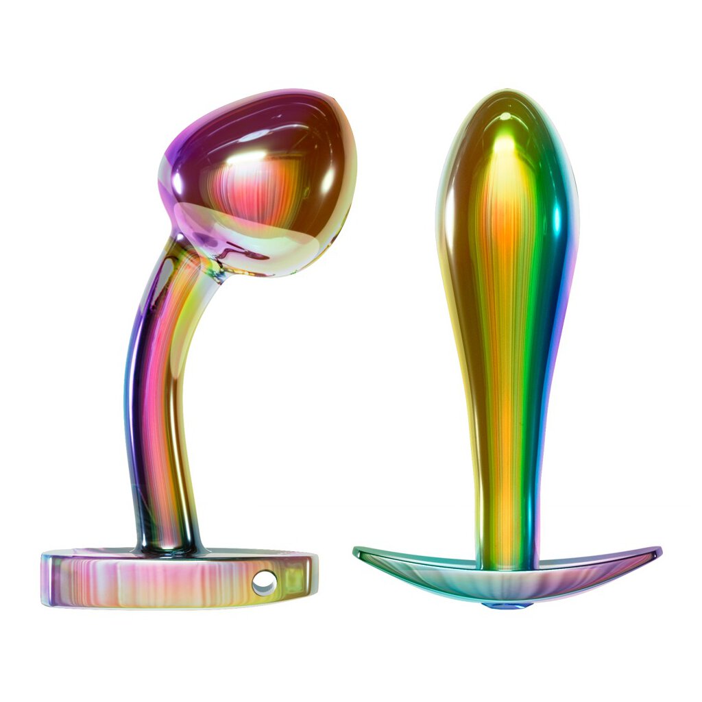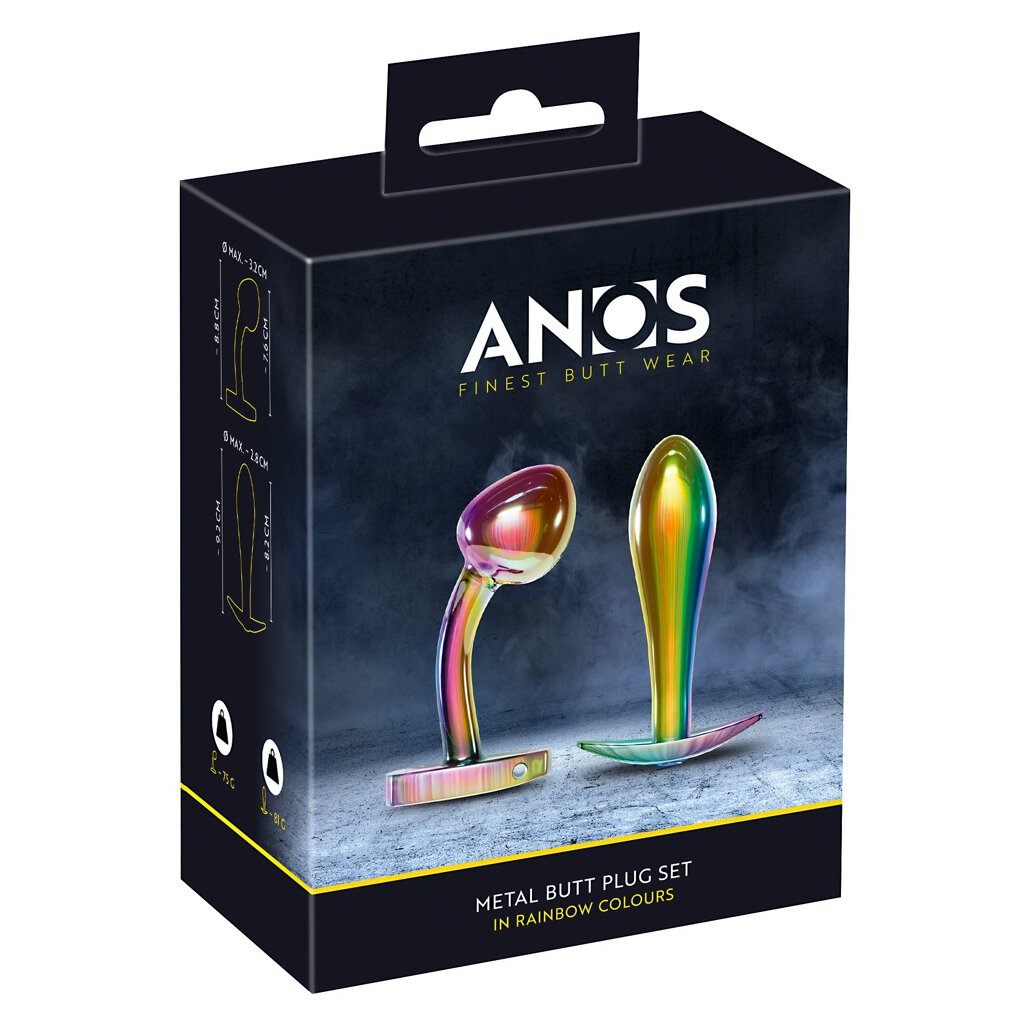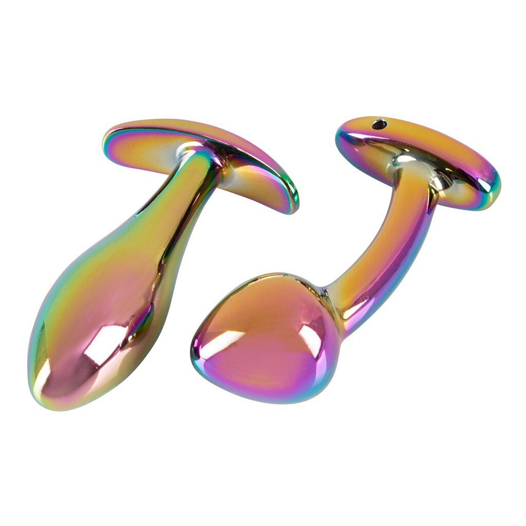 Ensemble de plugs anaux en métal aux couleurs de l'arc-en-ciel par ANOS avec 2 plugs anaux en métal aux précieuses couleurs irisées de l'arc-en-ciel. L'un est de forme conique classique, l'autre est légèrement incurvé avec une pointe en forme de point P. Les deux sont fabriqués de façon lisse et sans soudure.