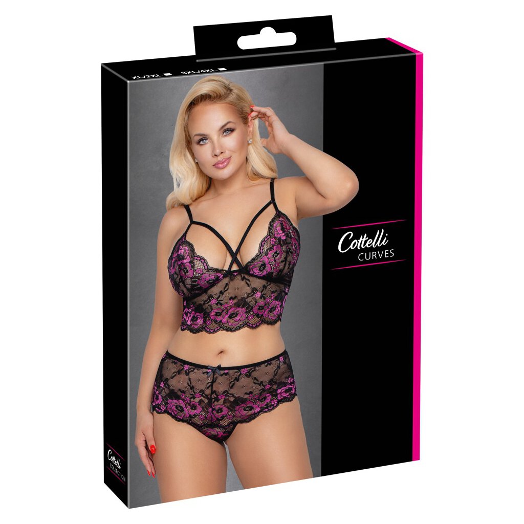 Soutien-gorge et slip sans fil, longline de Cottelli CURVES, entièrement réalisés en dentelle florale douce et extensible dans 2 couleurs différentes. La dentelle s'accroche délicatement au corps et laisse transparaître la peau de manière séduisante. Le soutien-gorge long est doté de bretelles extensibles dans la zone du décolleté qui mettent en valeur les bonnets. Les bretelles extensibles peuvent être ajustées pour un ajustement parfait.