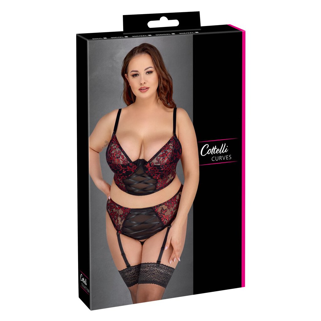 Longline-BH und Straps-Höschen im Set von Cottelli CURVES in einem feinen Materialmix aus 2-farbiger weicher Stretch-Blumenspitze und feinem elastischen Powernet. Beide Vorderseiten sind zusätzlich mit einer Satin-Zierschnürung versehen. Der Longline-BH überrascht mit seinen abknöpfbaren Spitzencups, unter denen sich ein gefütterter Bügellift verbirgt. Die Träger und der Hakenverschluss im Rücken sind in der Passform verstellbar. Das hüfthoch geschnittene Straps-Höschen verführt mit einem abknöpfbaren Schritt, so dass das Höschen auch im Schritt getragen werden kann. Die beiden Strapshalter vorne sind verstellbar und ebenfalls komplett abnehmbar.