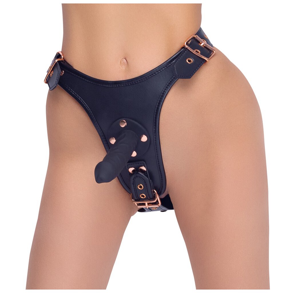 String-on de Bad Kitty avec 3 godes naturels de tailles différentes, qui sont fermement insérés dans le string et dans l'entrejambe. String à l'aspect cuir élégant avec des bords soignés et des détails métalliques de couleur or rose. Réglable dans chaque cas sur le côté et dans l'entrejambe avec des fermetures à boucle pour un ajustement ferme et confortable. Chaque gode a l'aspect d'un pénis avec un gland prononcé et des veines.