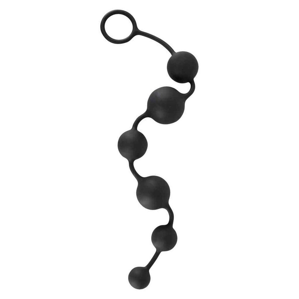 Schwarze Kugelkette mit sechs Kugeln von unterschiedlichem Ø (2,3-3,9 cm). Leicht dehnbar. Mit Rückholring. Gesamtlänge ca. 40 cm. Material: Silikon.