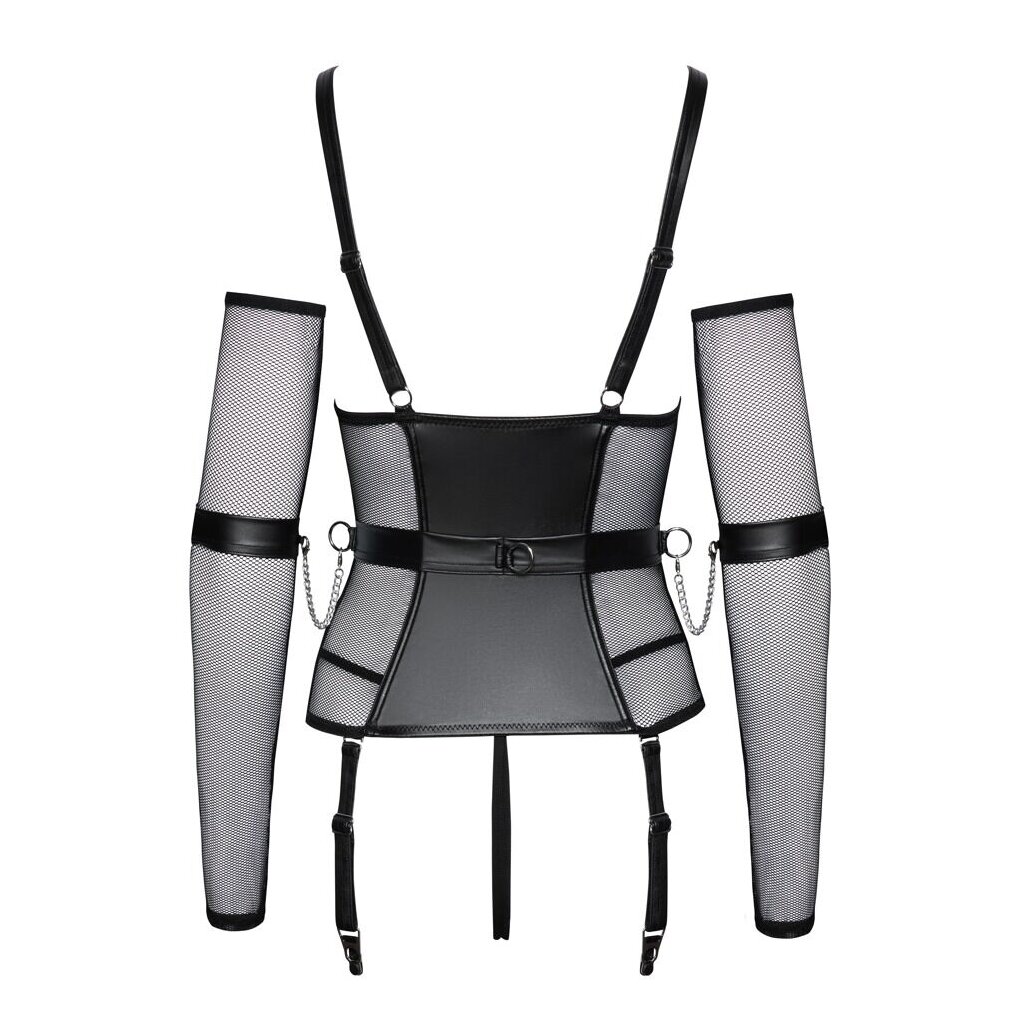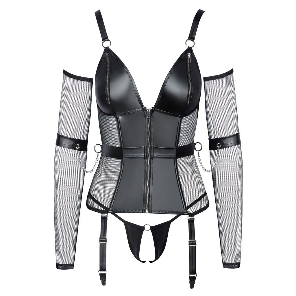 Lingerie set from Cottelli BONDAGE with suspender shirt, thong, arm warmers and arm cuffs. Stylish, stretchy material mix in a matt look with mesh and silver-colored accessories. Suspender top with full-length zipper at the front and zippers in the pre-shaped cups. With shaping bones for a perfect fit. The wide straps can be adjusted for a perfect fit. There is a ring on the side of the waistband and at the back for attaching the enclosed cuffs with carabiner chains. The ankle straps can be quickly put on and adjusted using the Velcro fasteners. The adjustable suspenders are completely detachable. The long, soft mesh sleeves and the crotchless string with a matte finish complete this gorgeous outfit.