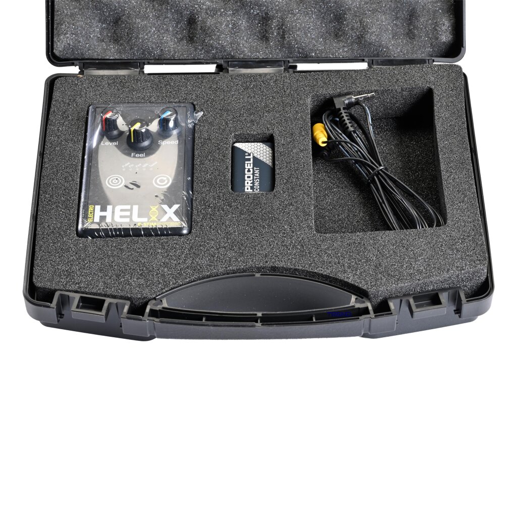 - Mitgeliefertes Zubehör: 1 x 3,5-mm-auf-2-mm-TENS-Anschlusskabel / 4 x selbstklebende Elektro-Pads / 1 x PP3-Batterie / 1 x Benutzerhandbuch / 1 x Tragekoffer