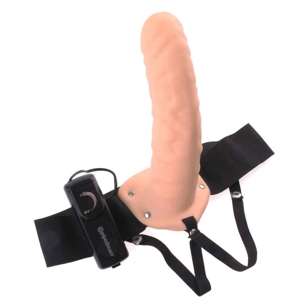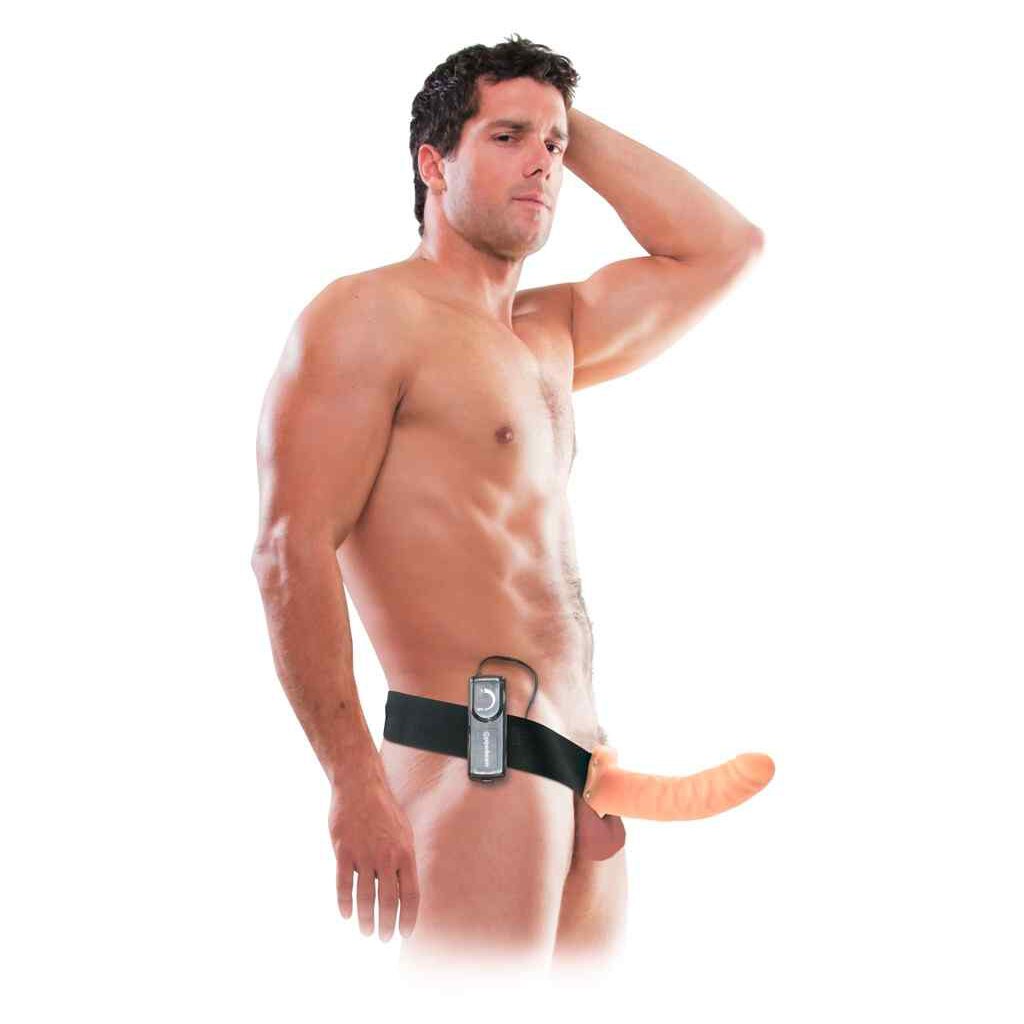 Dildo réaliste creux avec un harnais élastique et réglable et des vibrations à plusieurs vitesses qui peuvent être réglées avec la télécommande sur un fil. IL le porte pour plus de longueur et de circonférence. ELLE le porte pour lui donner du plaisir. Veuillez commander les piles séparément : 2 x AA.