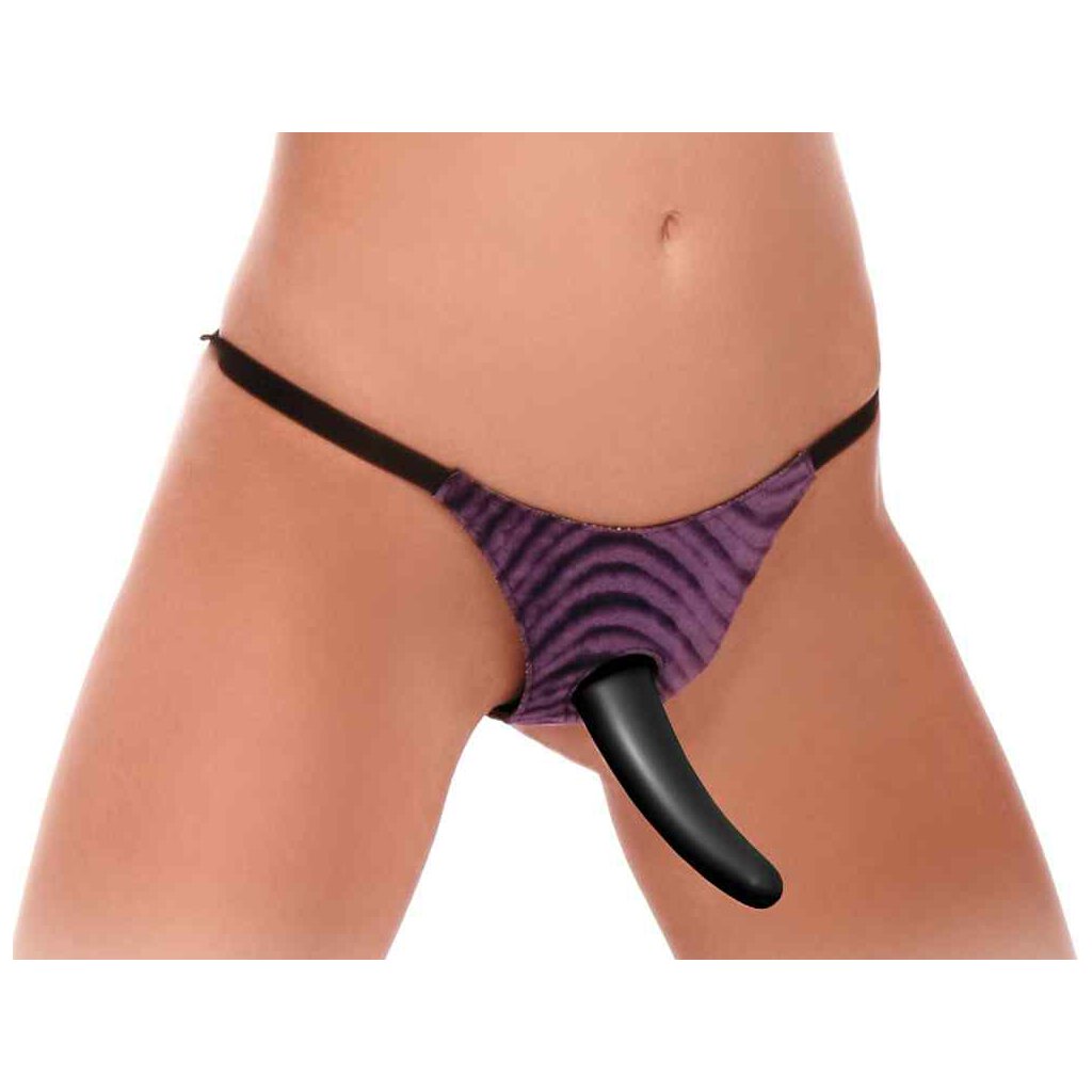 Strap-On-String mit herausnehmbarem Dildo und Vibrobullet für grenzenlosen Pegging-Spaß - und auch zur Erfüllung von lesbischen Stoß-Träumen. Ideal gebogener Dildo mit Saugfuß und schmal zulaufender (P-Punkt-) Spitze - auch solo und sogar freihändig bespielbar. Wird ruckzuck in den String vorne in die Öffnung eingesetzt. Das beiliegende Vibrobullet kann für prickelnde Zusatzstimulationen ebenfalls vorne im String platziert werden. String mit Stretchbändern passend für Größe S bis L. Batterien für das Vibrobullet inklusive.