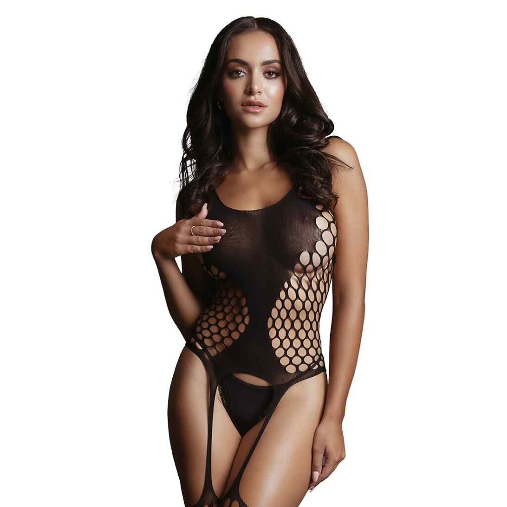 Bodystocking mit Strumpfhalter und großen Lochmustern, um den sexy Körper gekonnt in Szene zu setzen. Das weiche, super dehnbare Material passt in den Größen S bis XL.
