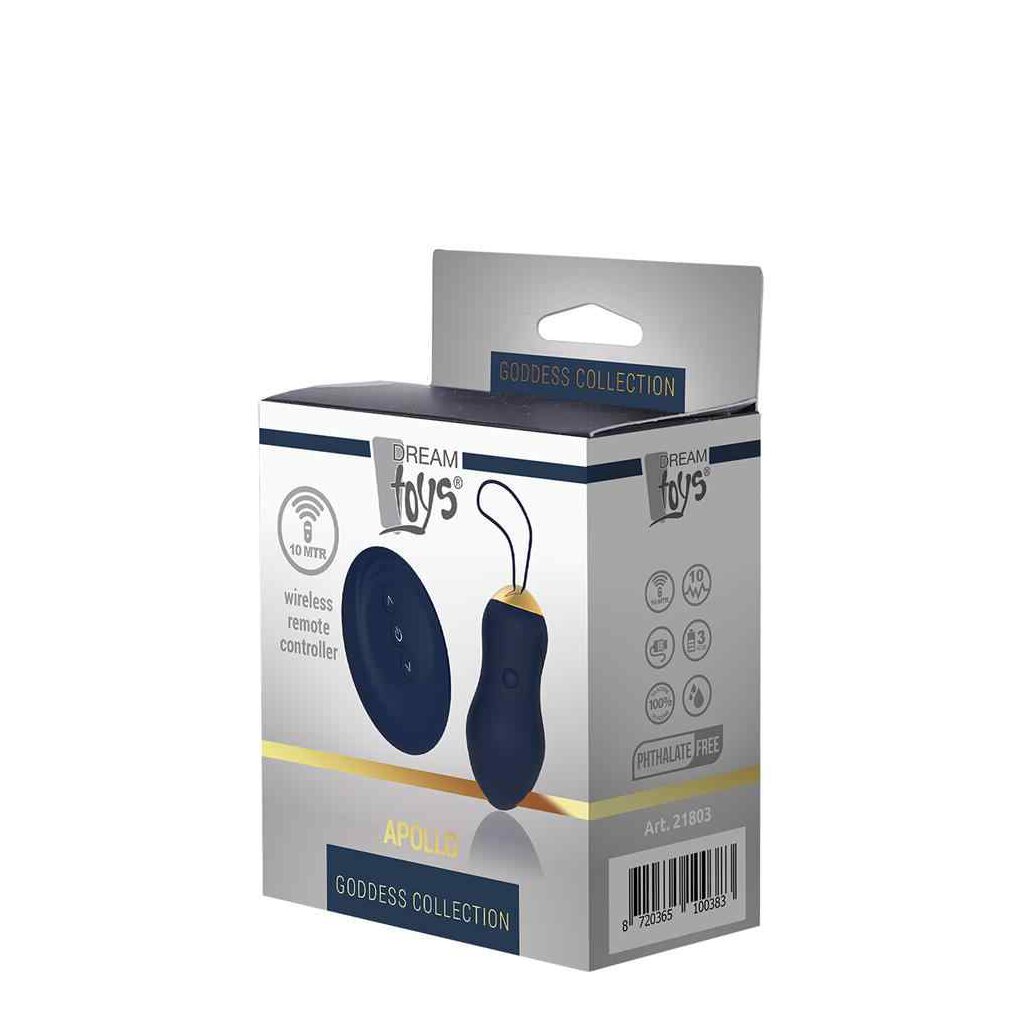 Apollo ist ein vibrierendes Ei mit einer Fernbedienung. Großartig für die interne Stimulation mit einfacher Bedienung und einer starken Zugschnur für einfaches Abrufen. Das Apollo-Ei sieht dank der glatten Form, dem dunkelblauen Silikon und den goldfarbenen Details sehr edel aus. Dieses Lust-Ei bietet 7 Vibrationsrhythmen in 3 Geschwindigkeiten, so dass es immer eine Vibration gibt, die den Bedürfnissen des Benutzers entspricht. Die Vibration kann während des Gebrauchs mit den Pfeiltasten auf der kabellosen Fernbedienung, die eine Reichweite von 10 Metern hat, einfach eingestellt werden. Sowohl das Ei als auch die Fernbedienung können über das mitgelieferte USB-Kabel wieder aufgeladen werden.