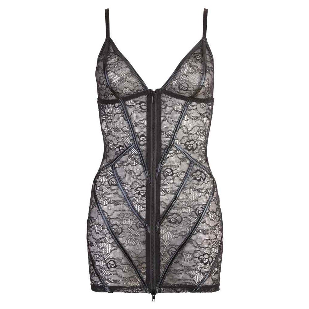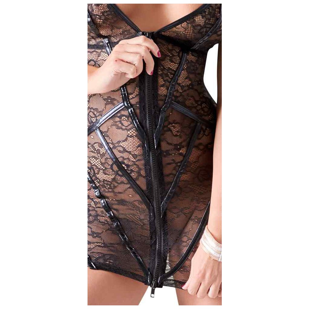 Dieses schwarze Kleid aus feiner Blumenspitze mit rockigen Wetlook-Streifen in der Front ist gar nicht so unschuldig, wie es auf den ersten Blick wirkt, denn mit nur einem Zug vorn am durchgehenden Zwei-Wege-Reißverschluss enthüllt es alles, was darunter liegt... Träger verstellbar. 90% Polyamid, 10% Elasthan.