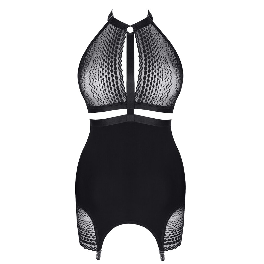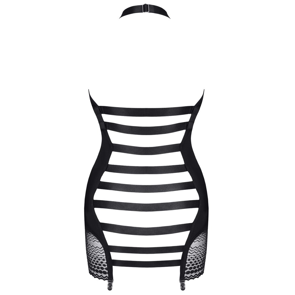 Une robe intrigante avec un dos sexy et des porte-jarretelles. Le décolleté avant est fait de dentelle noire caractéristique en motif géométrique. Il s'harmonise magnifiquement avec la composition de bandes élastiques noires ornées d'un anneau métallique de couleur argentée. Dans le dos, il y a une attache métallique de couleur argentée au niveau du cou. La partie inférieure de la robe est faite d'une matière noire, agréable au toucher et élastique. Ses caractéristiques font qu'il s'adapte parfaitement au corps, soulignant la taille et la forme ronde des hanches. Le dos et les fesses nus, soulignés par des lignes horizontales, ravissent et incitent au jeu. La coupe dans le dos est en forme de sablier. Elle modèle visuellement la silhouette de manière sexy : elle réduit optiquement la ligne de taille tout en soulignant la forme ronde des fesses et des hanches. Tous les élastiques utilisés dans la robe sont d'excellente qualité, durables et agréables au toucher, avec un matériau légèrement métallique brillant, qui donne à la robe un charme supplémentaire. Il y a des fermoirs de jarretières métalliques décoratifs au bas.