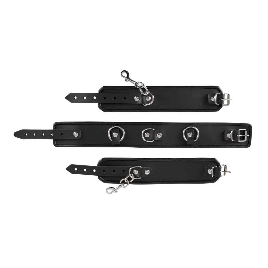 The hand cuffs can be attached to the neck at the side by the hook. Neck collar with D shaped ring at the front. Multi adjustable hooks and hemmed cuffs. Black. Material: split leather, metal (cromer).