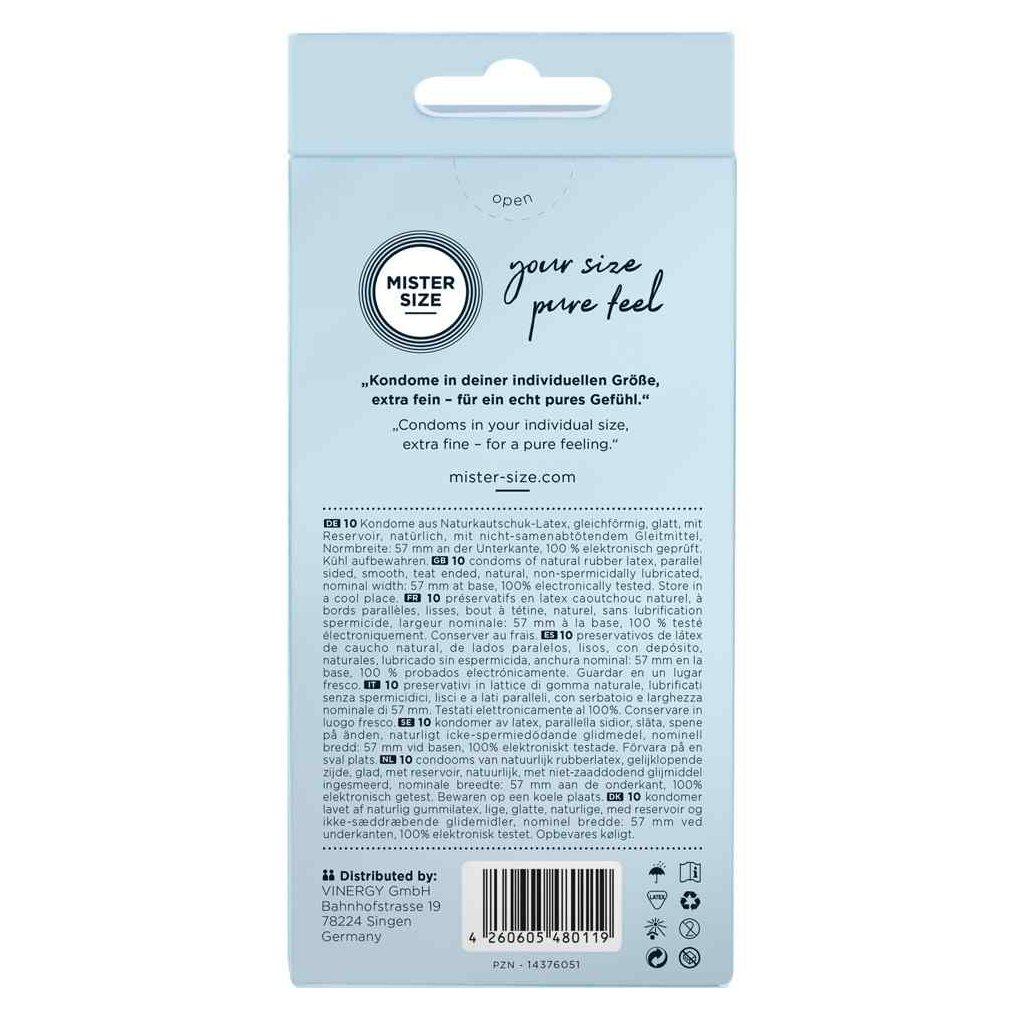 Transparente, hauchdünne Kondome Mister Size (57 mm) aus Naturkautschuklatex mit Gleitcreme-Beschichtung und Reservoir. Vegan.