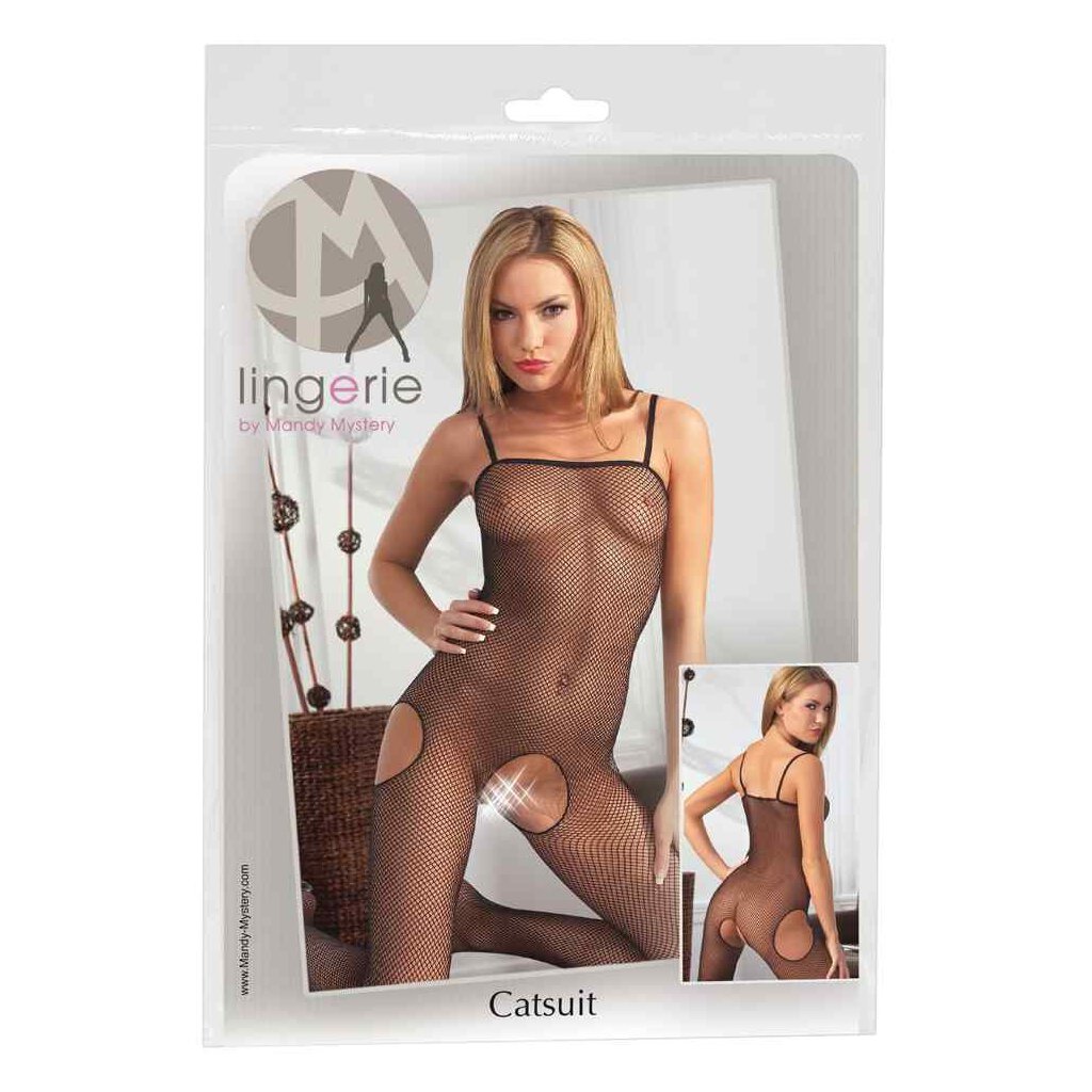 Netz-Catsuit aus schwarzem Stretch-Netz. Hier wird nichts der Fantasie überlassen. Im Schritt und seitlich provozierend offen. Schmale Träger. Mit Fuß. Nahtlos gefertigt. 100% Polyamid.