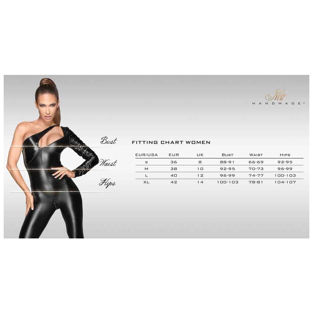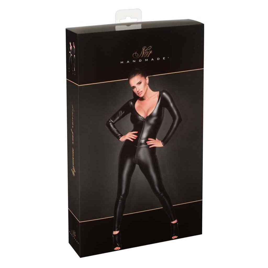 Very stretchy, long sleeve jumpsuit that is made out of beautiful black power wet look. The material is tight-fitting. The practical 2-way zip starts in the cleavage area, goes over the crotch and stops at the bottom of a triangle cut-out that is above the buttocks. The cut-out will make a partner want to caress and do other things in this area.