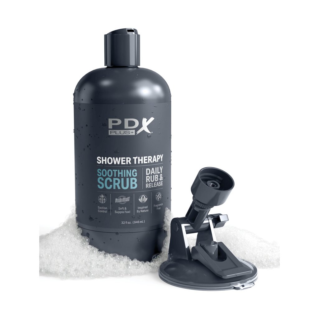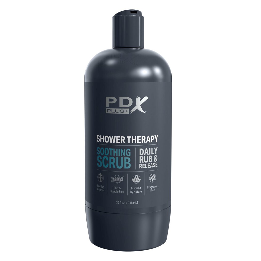 The Shower Therapy Soothing Scrub masturbator from PDX Plus looks like a neutral shampoo bottle from the outside. But when you unscrew the bottom cap, inside you'll find a lifelike replica of a vulva and vagina with an exciting nubbed texture for intense penis massage during a handjob. The bottle flip cap acts as a suction control to control the sucking blowjob sensations by simply opening and closing it.