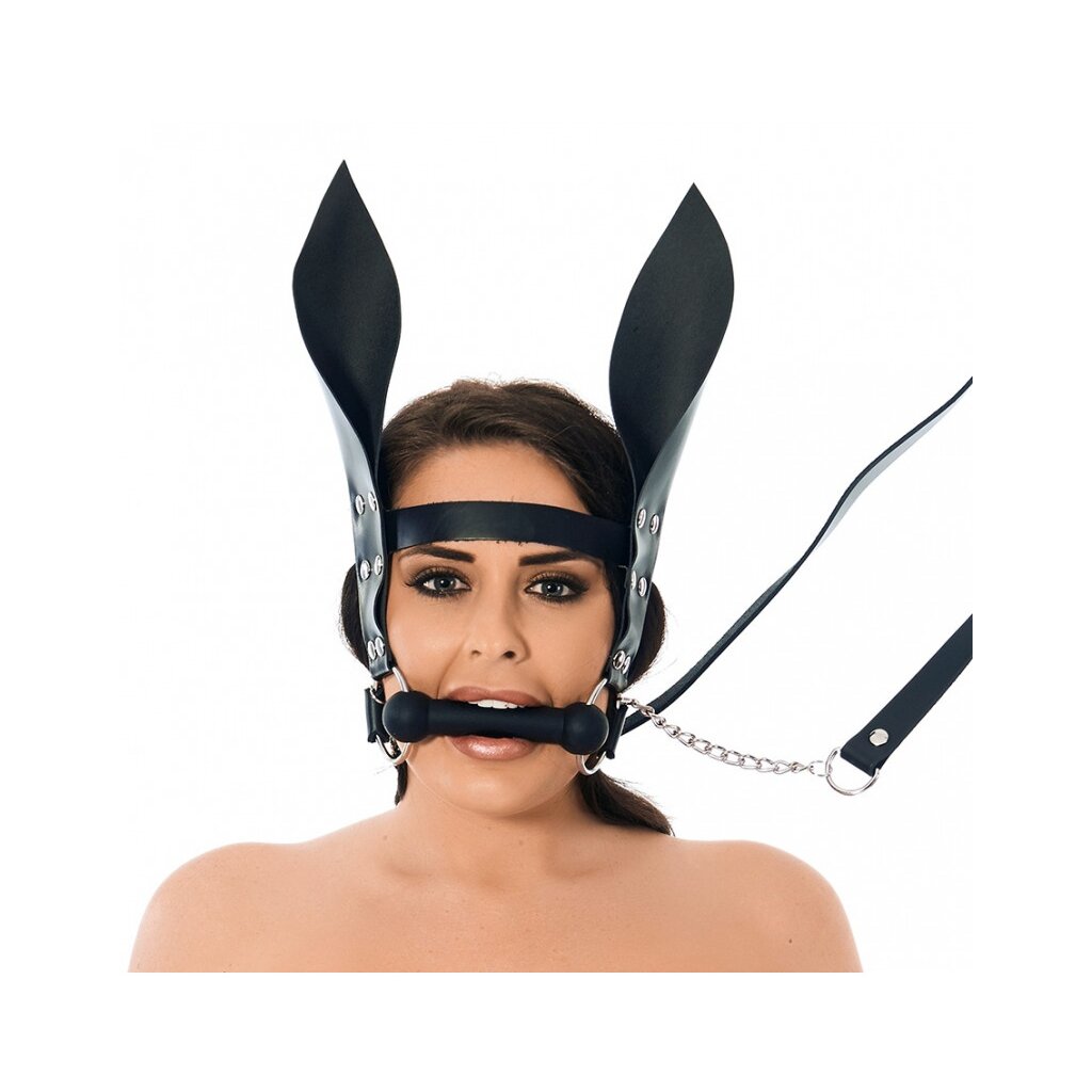 Rimba Bondage Play. Bit de cheval en silicone avec rênes et oreilles en cuir. Ce bâillon cosplay se ferme avec 2 sangles à l'arrière de la tête par des boucles métalliques. Réglable par boucles / Matériaux : cuir, métal