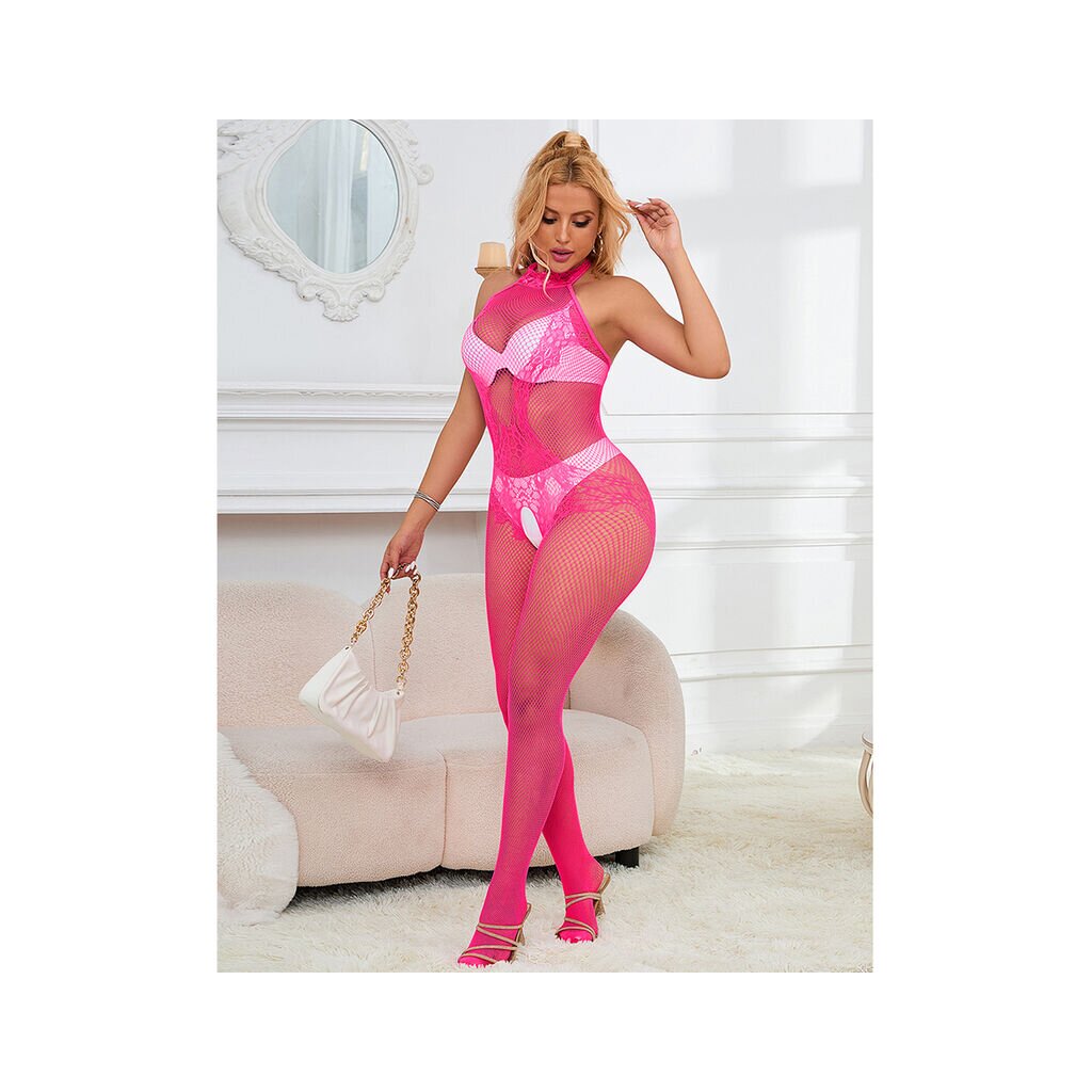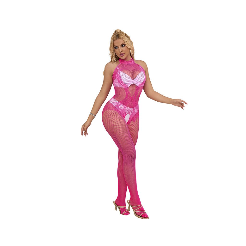 SUBBLIME Fishnet And Lace Crotchless Bodystocking With High Neck Pink One Size