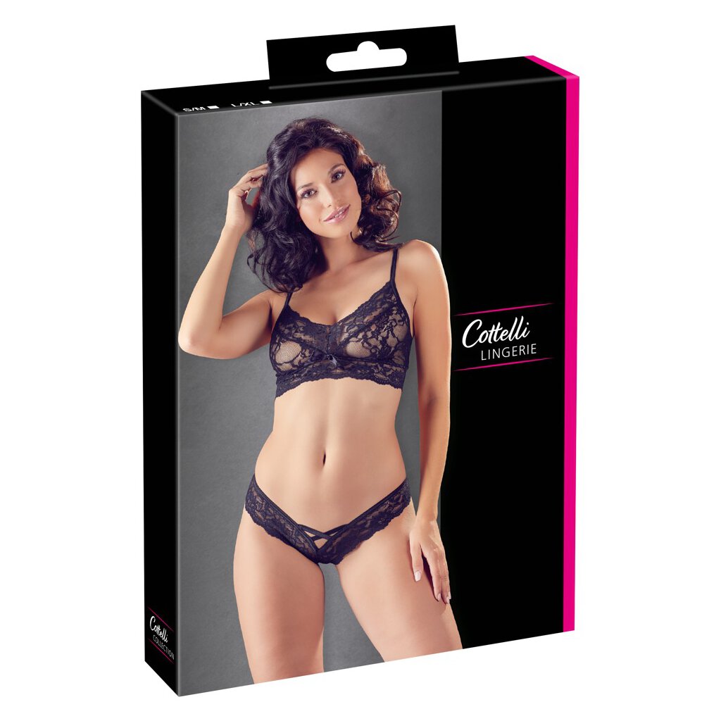 Wireless bra and briefs made out of soft lace. The bra has stretchy straps that criss-cross at the back. The briefs have stretchy criss-cross straps at the front and at the back.