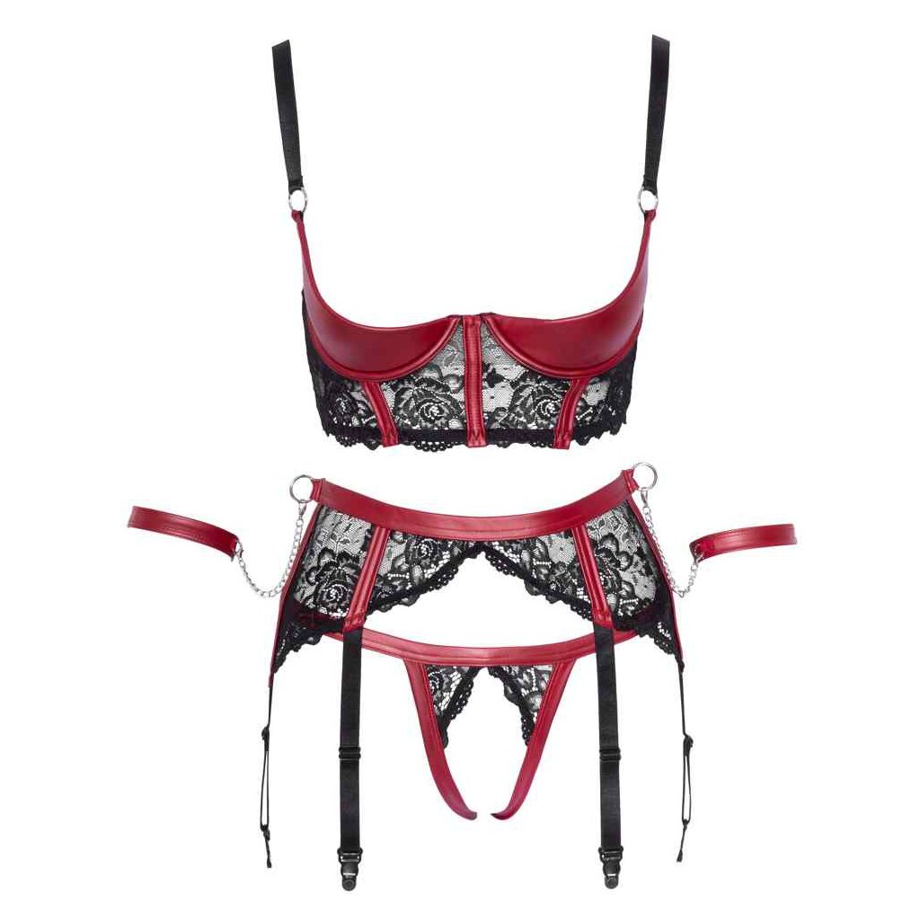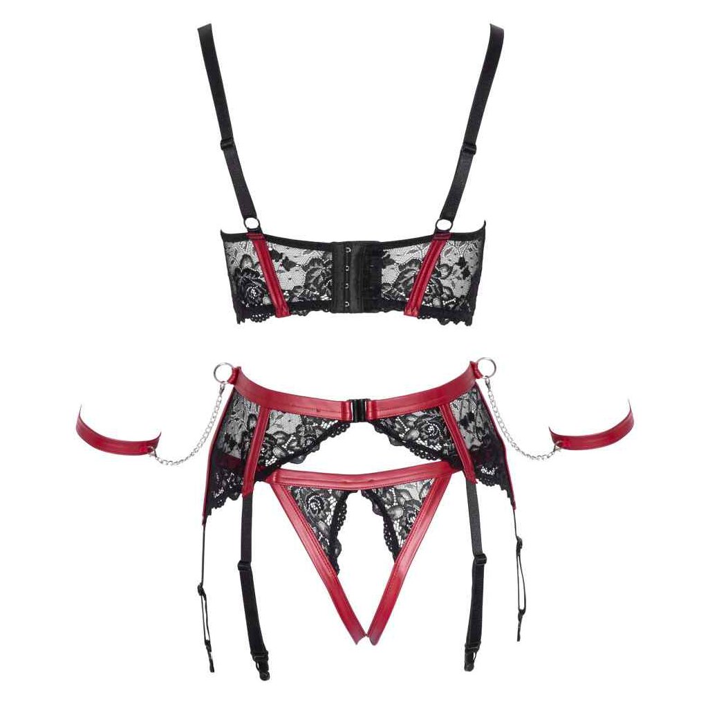 Ensemble de Cottelli BONDAGE : Soutien-gorge à étagères légèrement rembourré et à armatures, porte-jarretelles et string sans entrejambe en dentelle extensible combinée à un bel aspect mat. Le soutien-gorge à armatures est long, a une fermeture à crochets au dos et des bretelles légèrement plus larges qui sont réglables. Il y a des menottes/attaches de bras amovibles avec des chaînes qui peuvent être attachées aux anneaux de chaque côté du porte-jarretelles. Les menottes étroites sont munies de fermetures à crochets et à boucles réglables. Le porte-jarretelles est muni d'une fermeture à clip à l'arrière et de 6 bretelles réglables. Le string assorti est sans entrejambe.