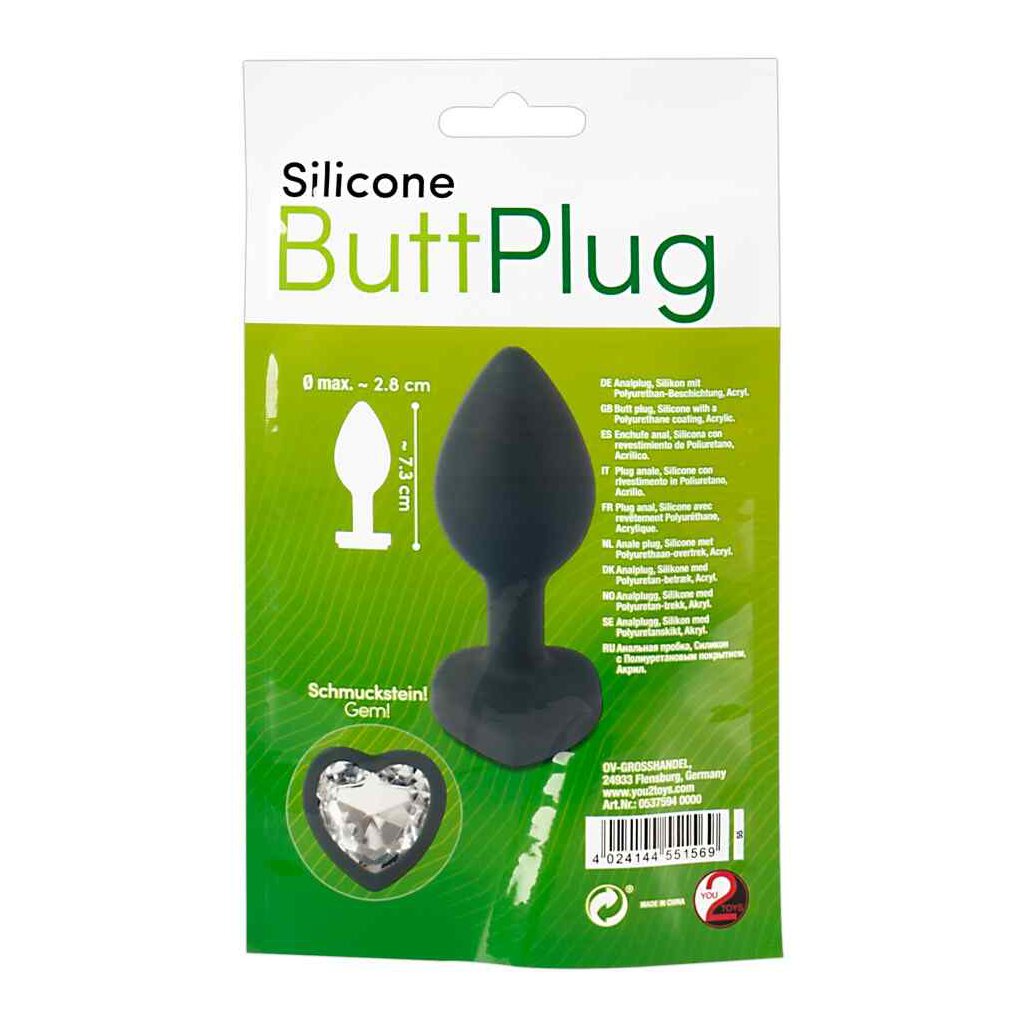 Butt plug that gets narrower towards the tip and has a heart-shaped gem on the stopper as well. This plug is perfect for beginners because it is small and light. The narrower tip means that it is easy to insert. The sparkly gem makes the backside a seductive, saucy eye-catcher.