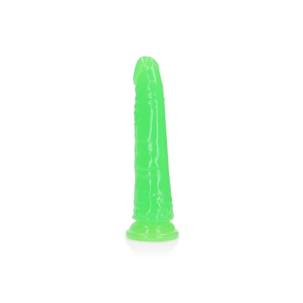 Ready for a GLOW IN THE DARK experience? Reach your climax in style with these beautifully moulded, glowing dildos. Any light source will activate the fun. This dildo is suitable for anal and vaginal use! Finger-like precision stimulation, ideal for delicious anal stimulation and definitely a friend of the clitoris? You'll find all that and more in this dildo! The base acts as a suction cup for hands-free use, but also gives it the option of being used in a harness. All REALROCK GLOW IN THE DARK dildos are phthalate-free, latex-free, body-safe and non-porous, making them easy to clean and giving them a longer shelf life. This model is 17.5 cm long including the suction cup, has an insertable length of 15.5 cm and a circumference of 3 cm. Product dimensions: 4.7 x 4.7 x 17.5 cm / Product weight: 104 g / Product diameter: 3 cm / Insertable length: 15.5 cm / Waterproof / Phthalate-free / Materials: TPE