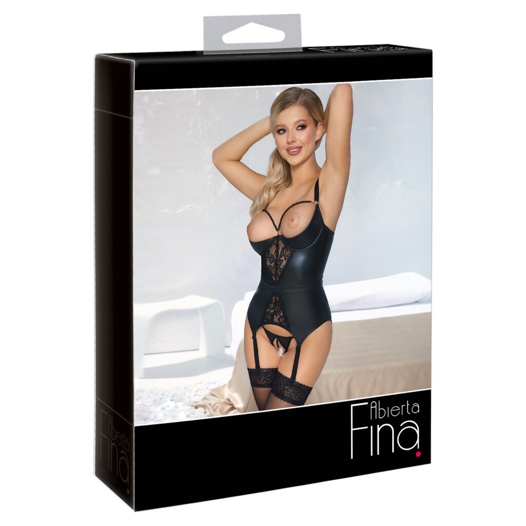 Porte-jarretelles et string ouvert dans un ensemble de Abierta Fina. Un porte-jarretelles sensationnel avec un aspect mat et doux. Devant avec des inserts en dentelle à la silhouette triangulaire. Une bande de taille solidement cousue met l'accent sur la silhouette. L'armature incorporée avec des bonnets légèrement rembourrés met le buste en valeur et le place directement dans le champ de vision. Le collier de perles décoratif qui encadre le buste dans le décolleté est amovible. Il se ferme dans le dos à l'aide d'un crochet. Les bretelles et les jarretelles sont réglables. Le collier de perles stimulant situé dans l'entrejambe ouvert du string d'aspect mat est également amovible.